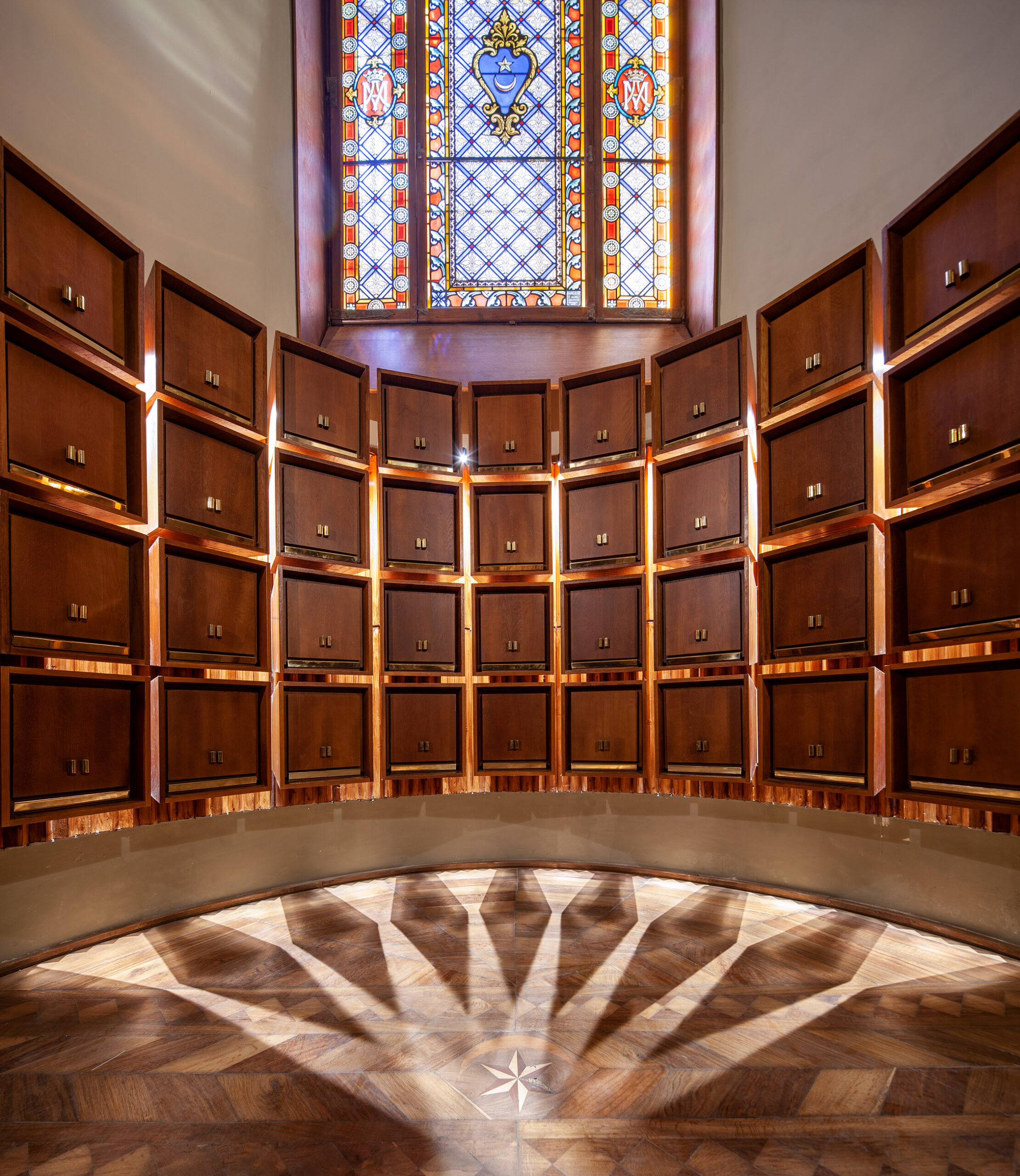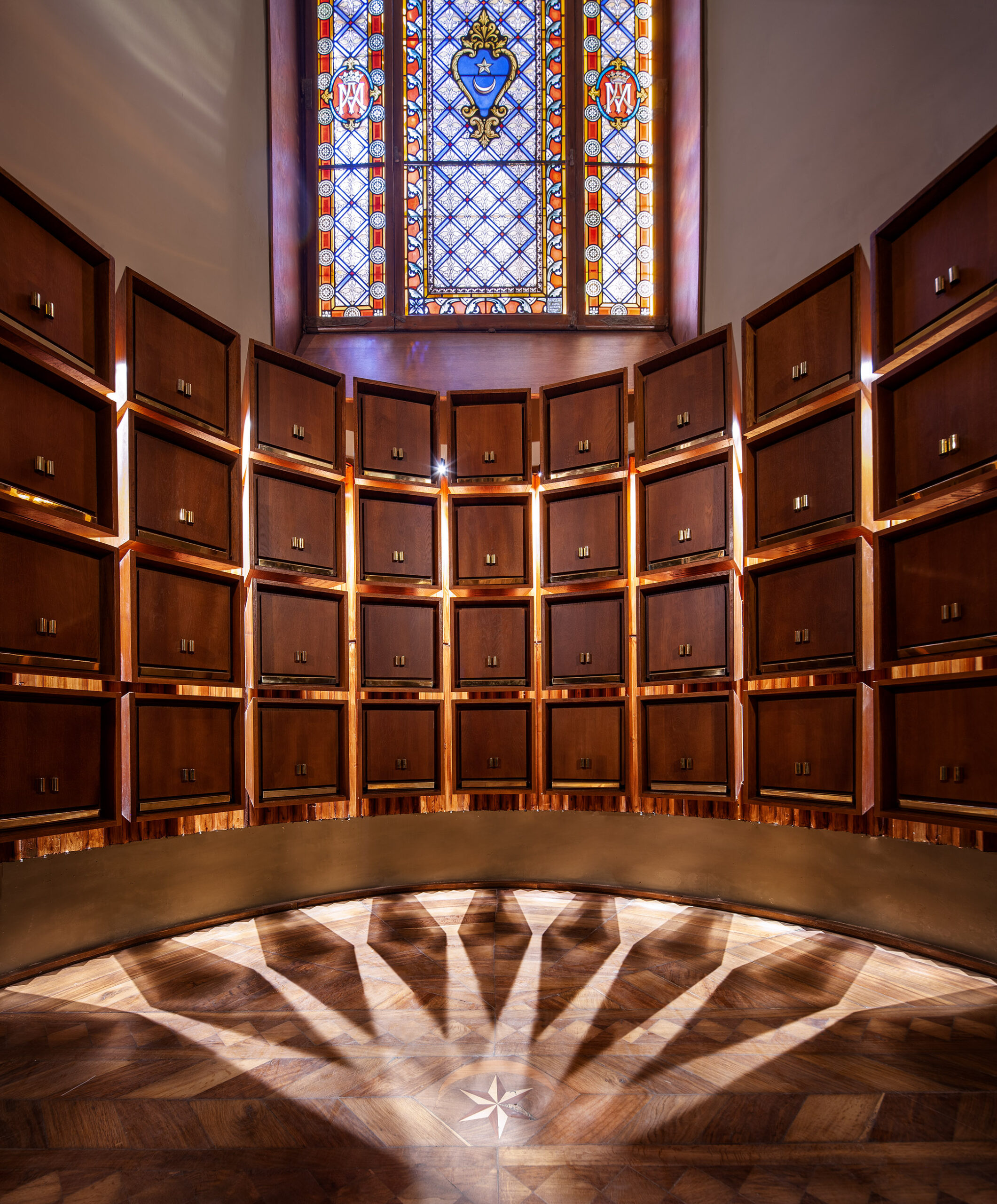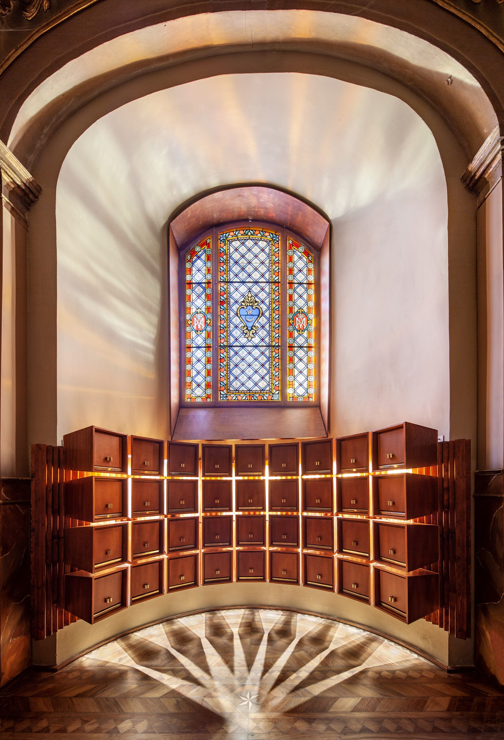Llegar a expresar lo que dibujan estas sombras y luces tuvo que ser precedido de mucha paciencia de todos…aunque los columbarios se construyeron al inicio de las obras, su montaje tuvo que esperar a las excavaciones, al respeto de los vestigios en el subsuelo, la ejecución de la ventilación del suelo, la reconstrucción de las bóvedas superiores, la restauración y mecanizado de las vidrieras, la recuperación y montaje del pavimento de madera, pero sobre todo al secado de los muros. Años de espera para una pequeña intervención.