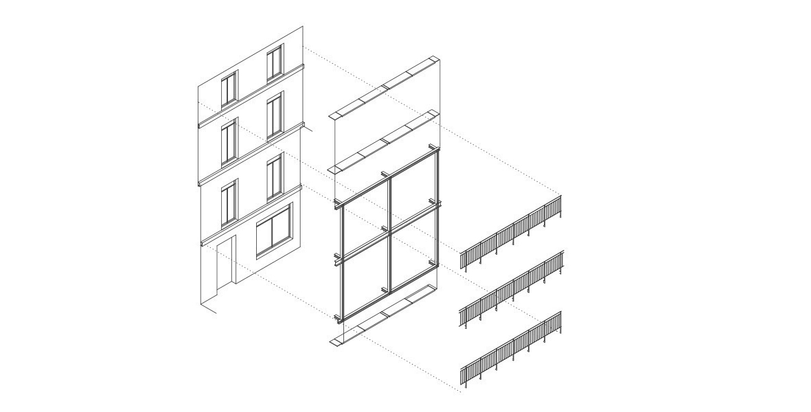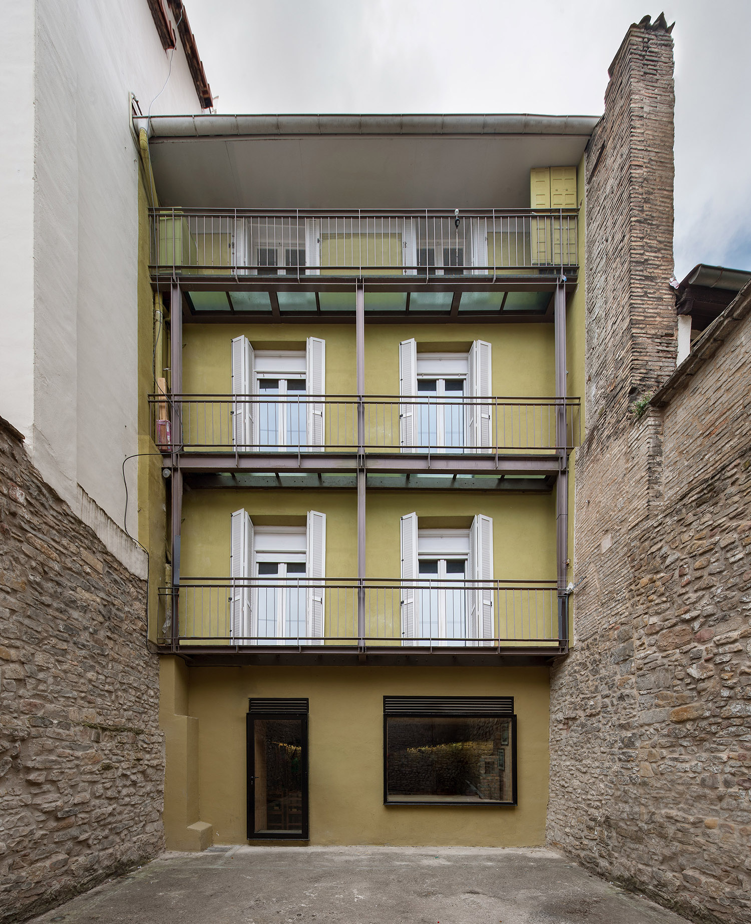 Obra de rehabilitación sujeta a ayudas públicas y desarrollada a lo largo de 6 años de dificultosa gestión que incluyó cambios e propiedad en los inmuebles. El mayor esfuerzo se realizó en la fachada posterior que fue completamente renovada. Se incluyó una estructura metálica como soporte de unos balcones de vidrio traslúcido.