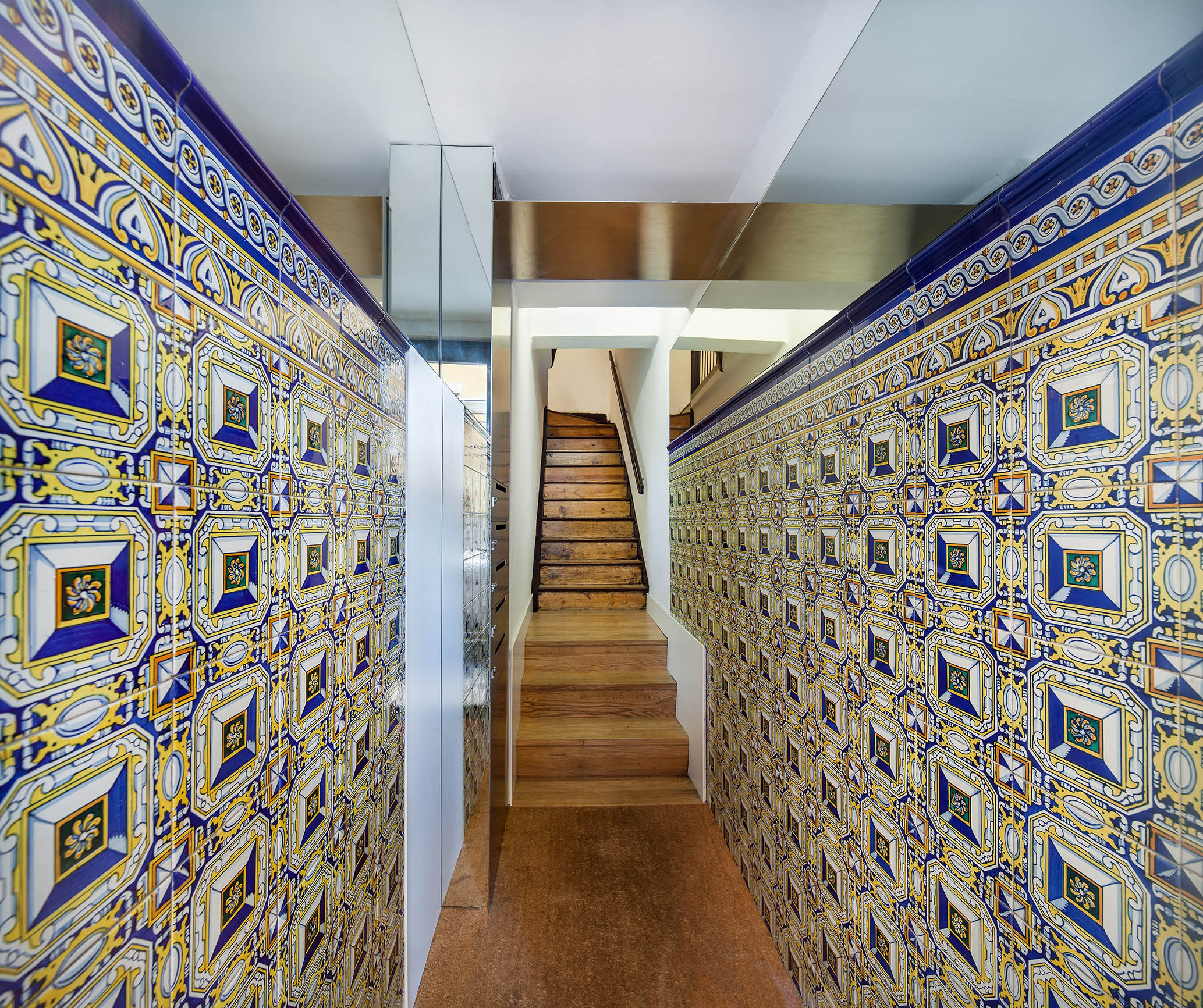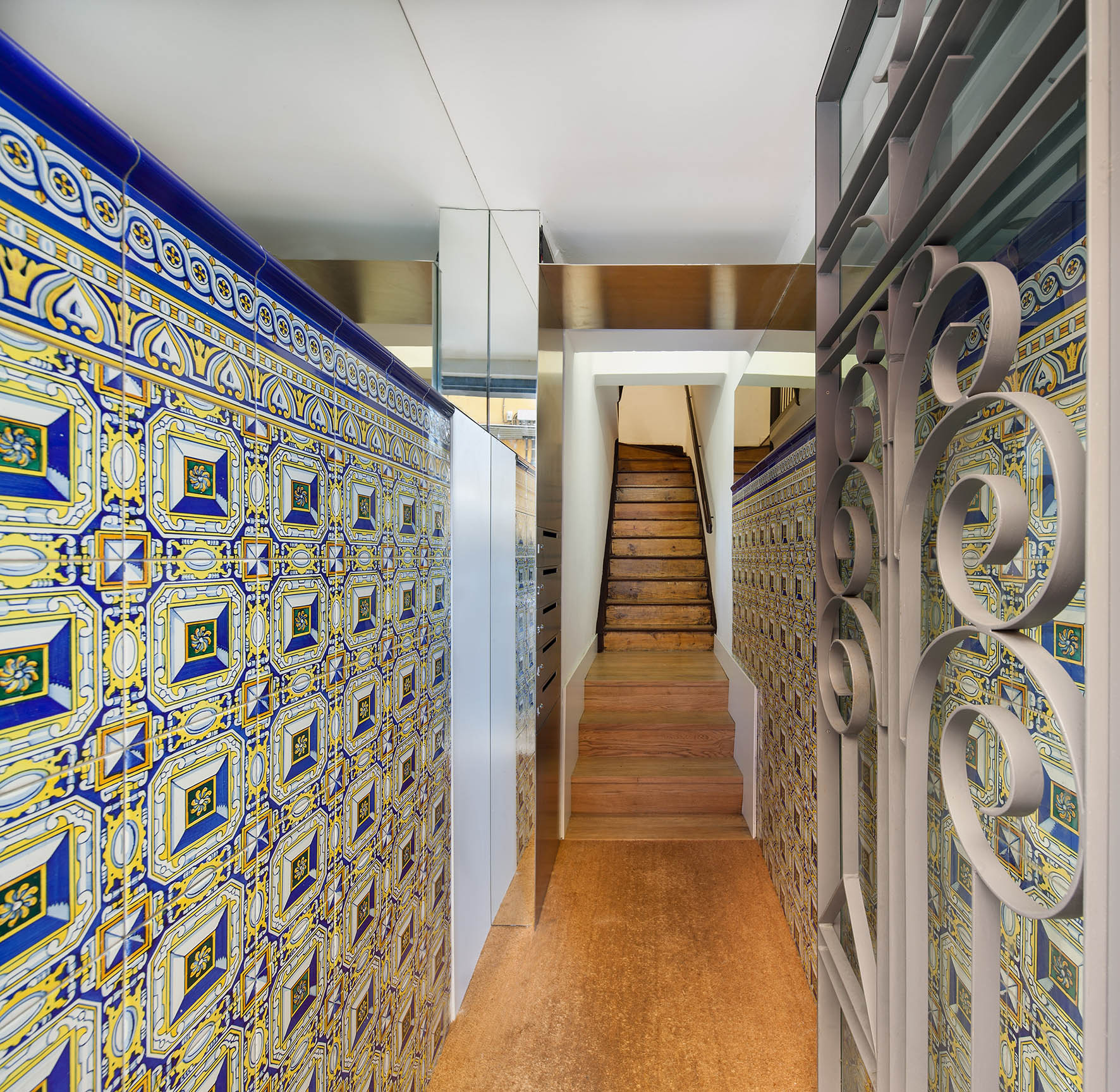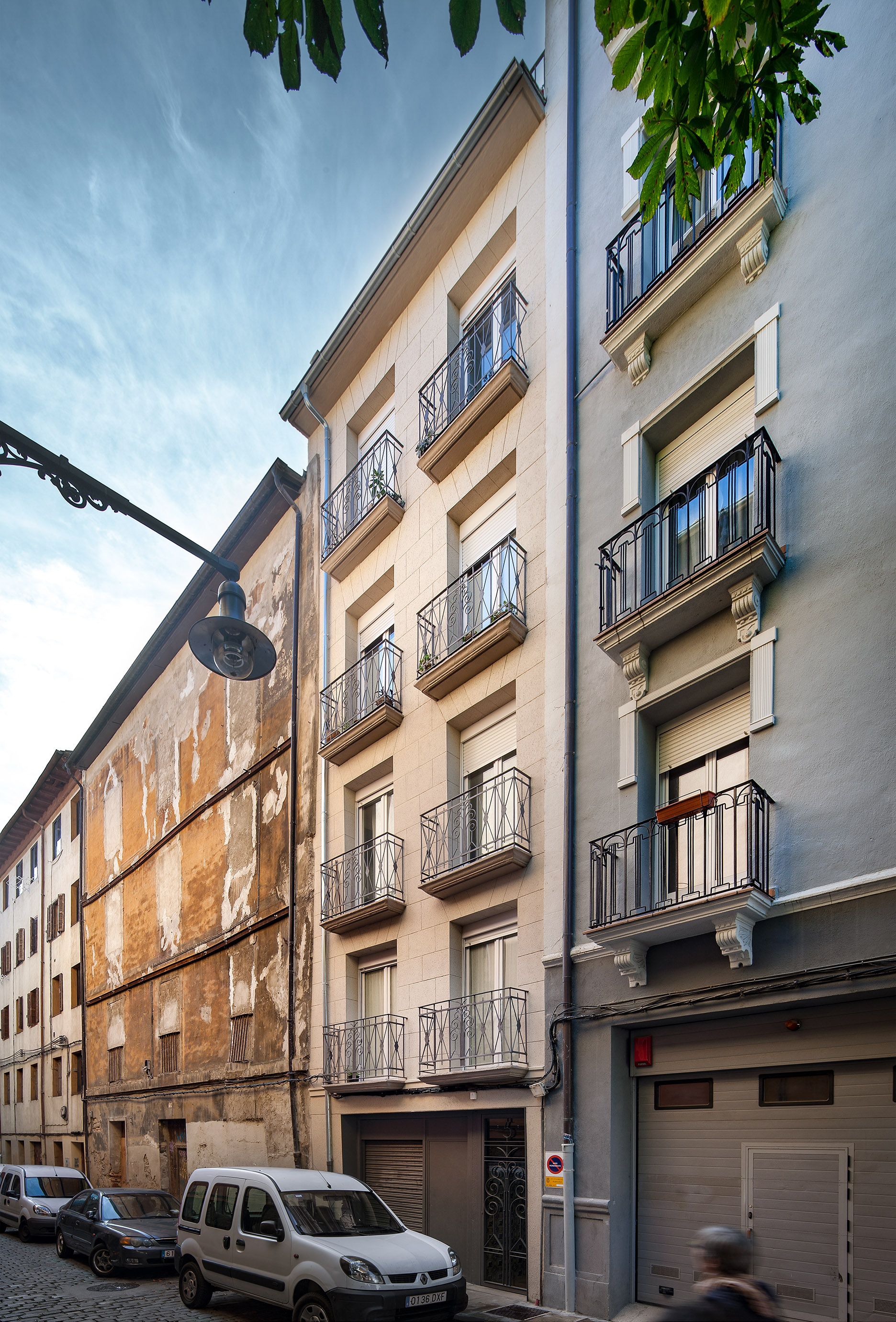 El trabajo de restauración en la fachada principal orientada hacia la calle fue completo pero no requirió intervención de carácter estructural. El portal de acceso también fue objeto de atención en sus acabados, para este espacio tuvimos la fortuna de localizar una remesa de piezas cerámicas con un diseño análogo al de las piezas preexistentes; y así mantener el carácter y singularidad del acceso a este edificio. Diseñamos una verja de protección para el portal siguiendo este mismo principio y para ello tomamos el patrón que adorna la forja de los balcones.