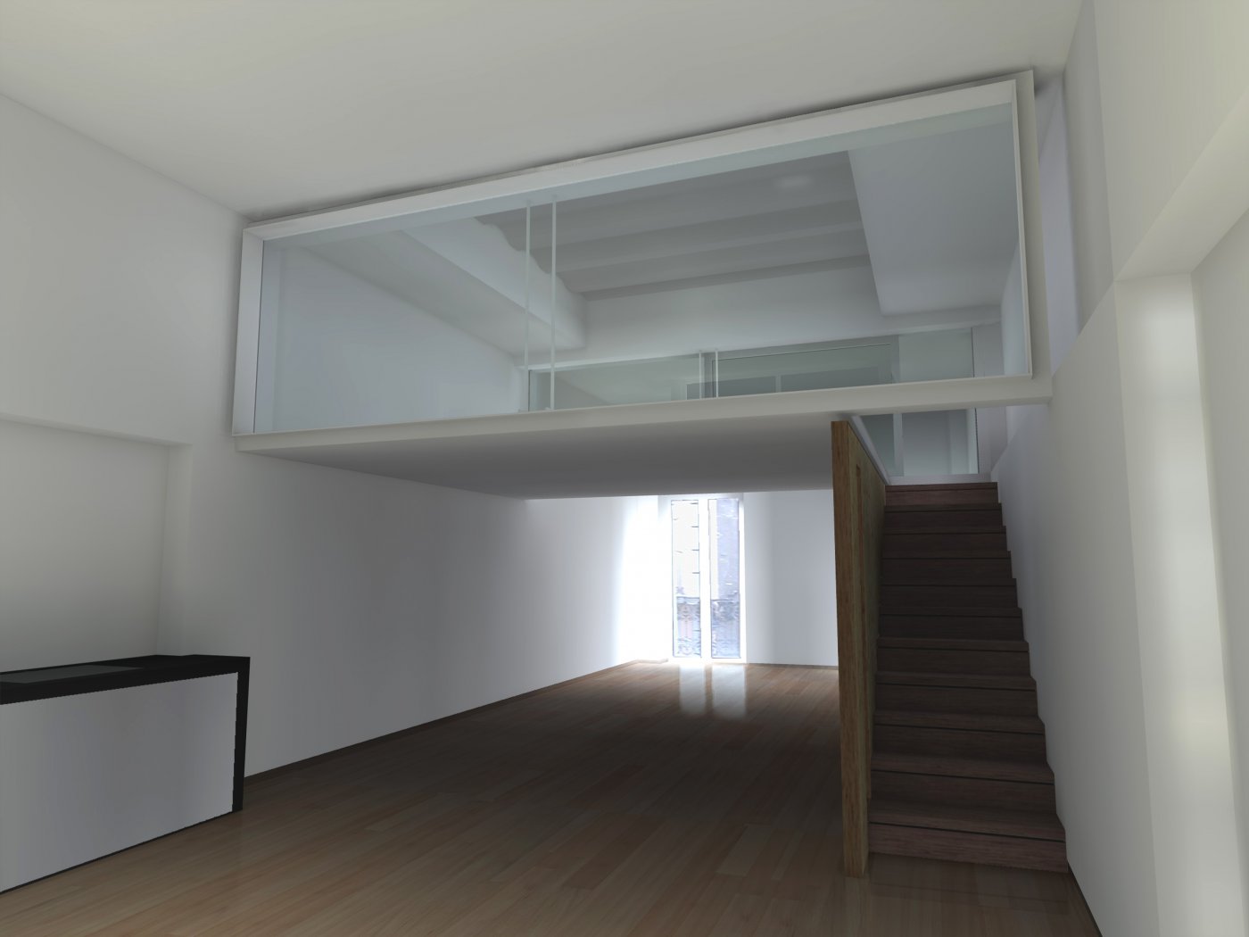 Al disponer de iluminación directa solamente desde una fachada se construyó una ligerísima estructura de vidrio y acero para alojar el dormitorio, flotando sobre un espacio único que integra cocina comedor y sala de estar.