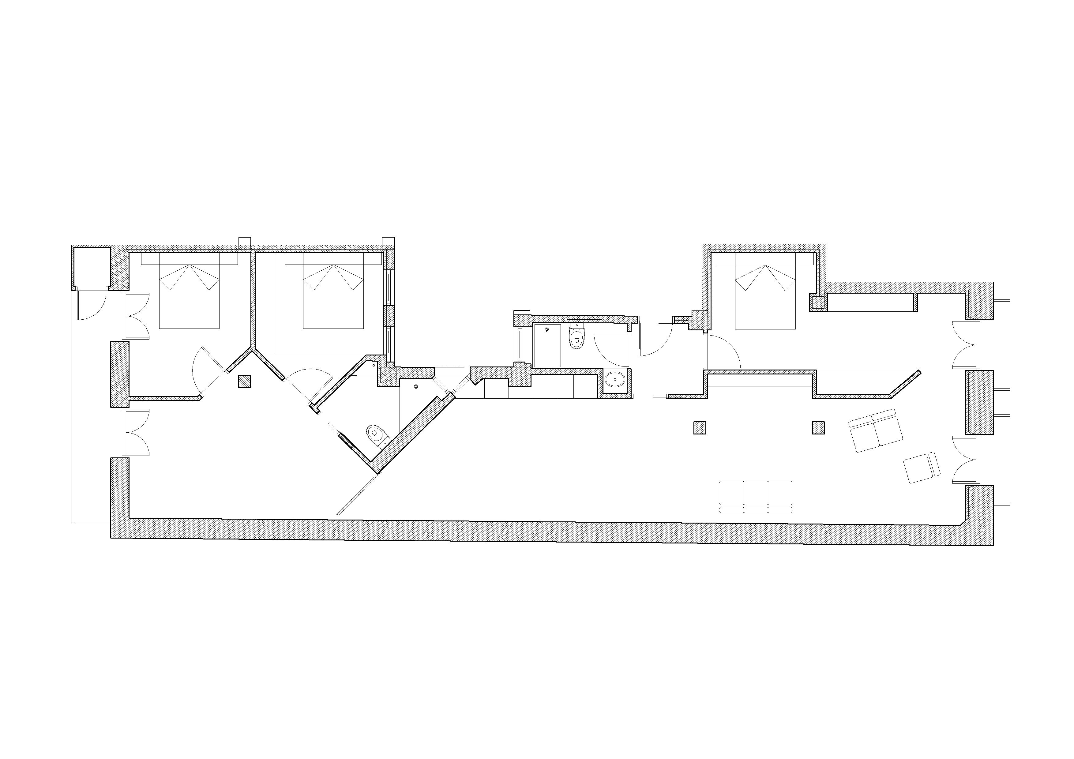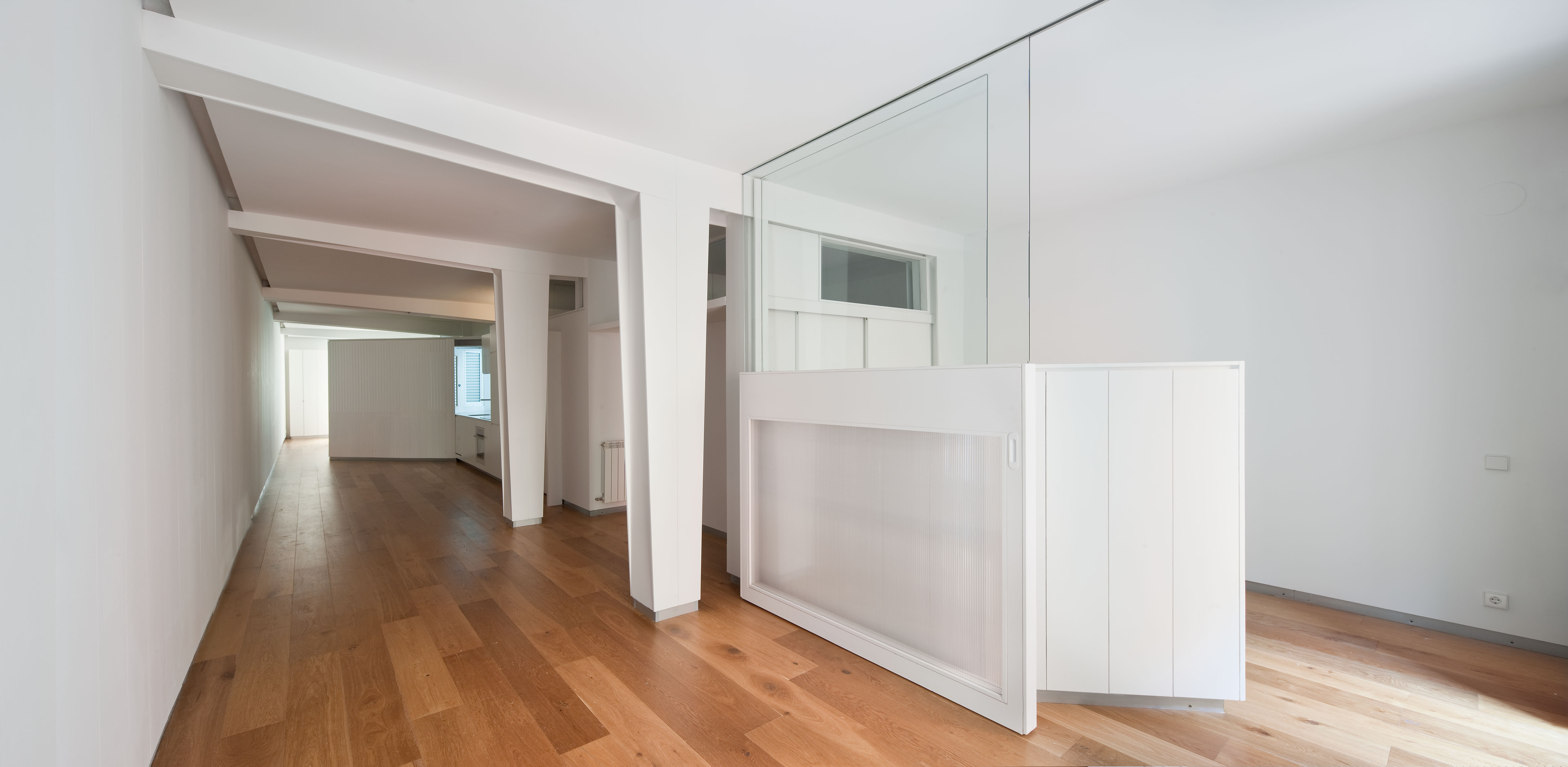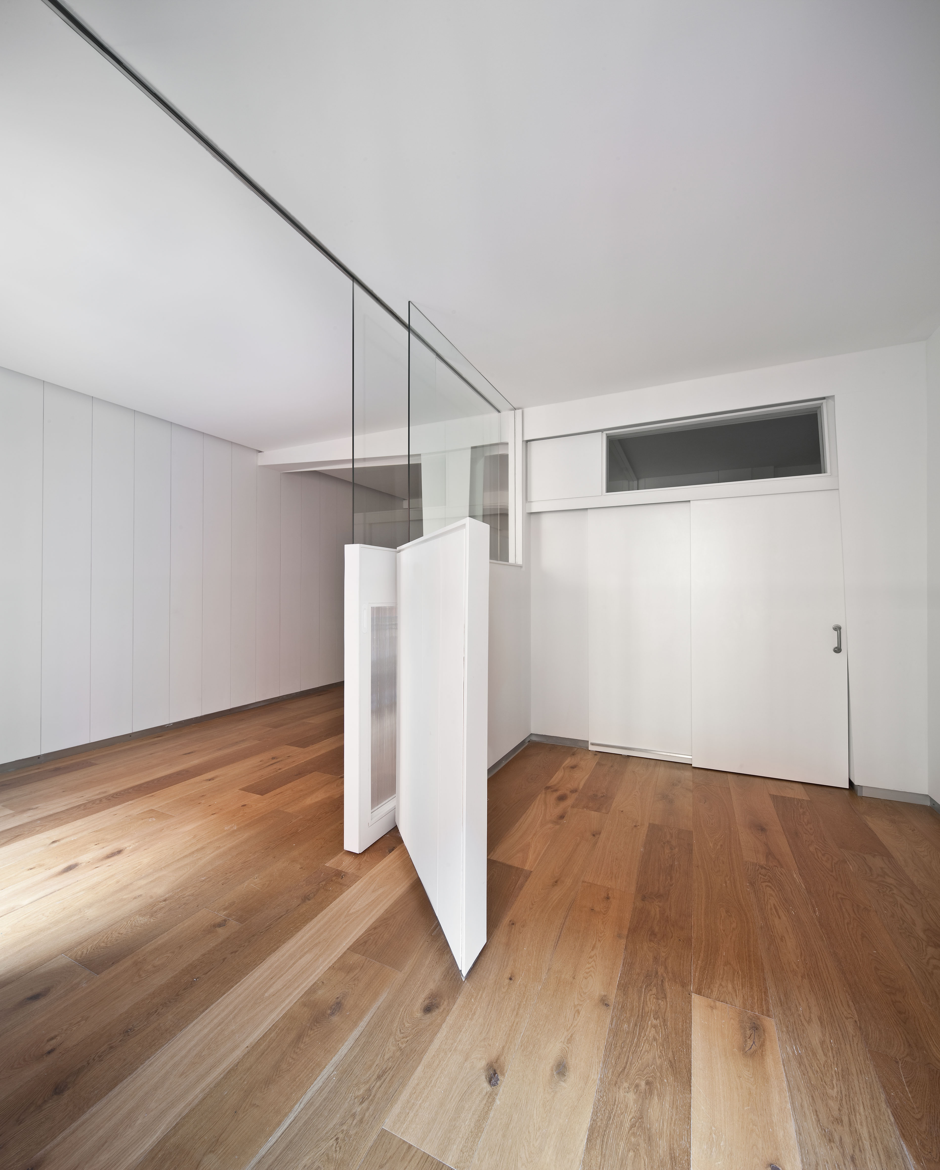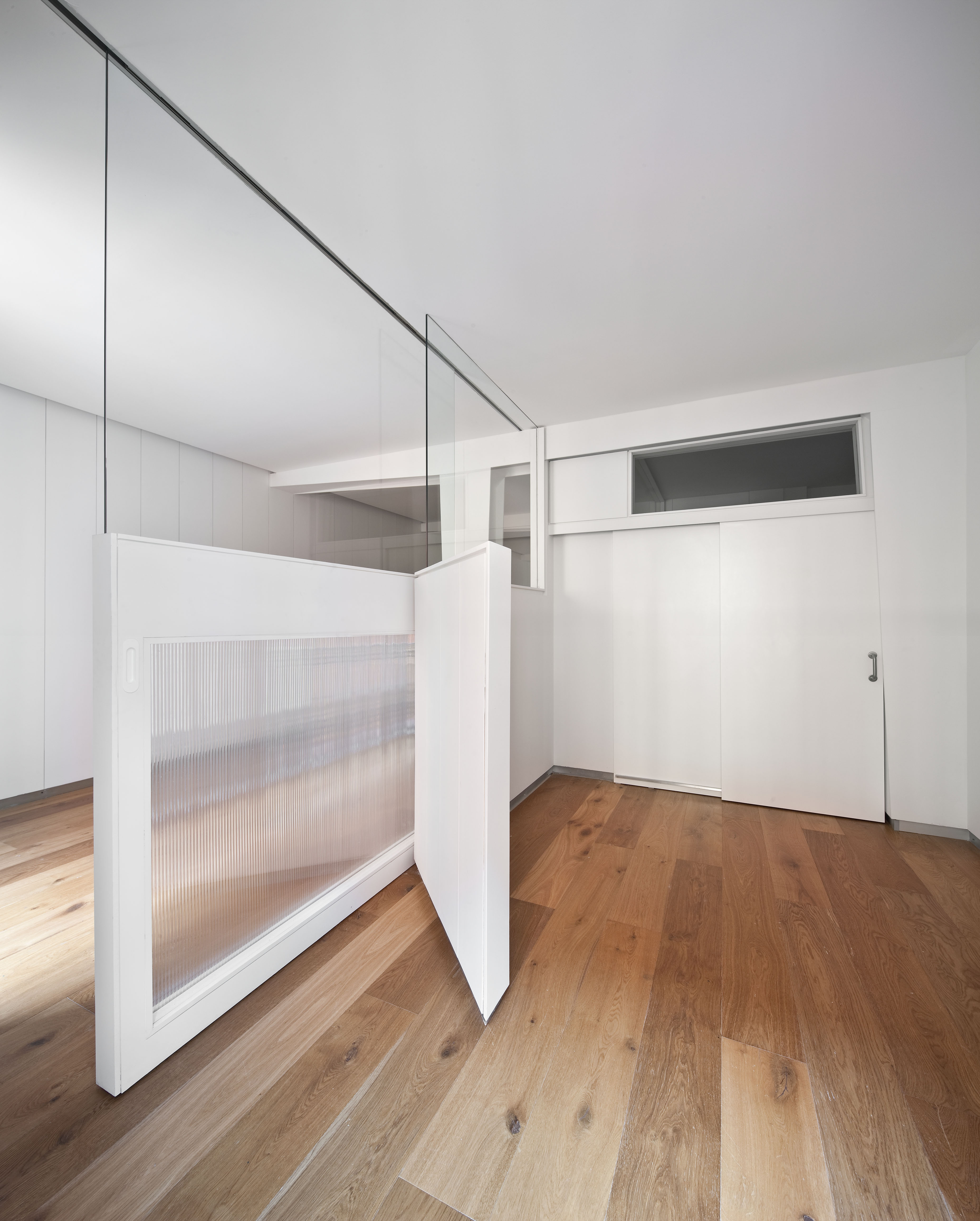 Integramos la tabiquería de todas las habitaciones en un zigzag ininterrumpido de madera y cristal que hizo compatible el concepto del espacio continuo de un loft urbano con la compartimentación del espacio en habitaciones independientes.