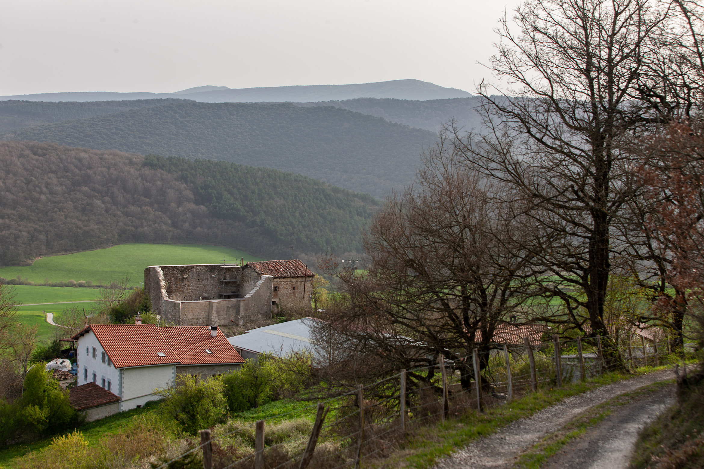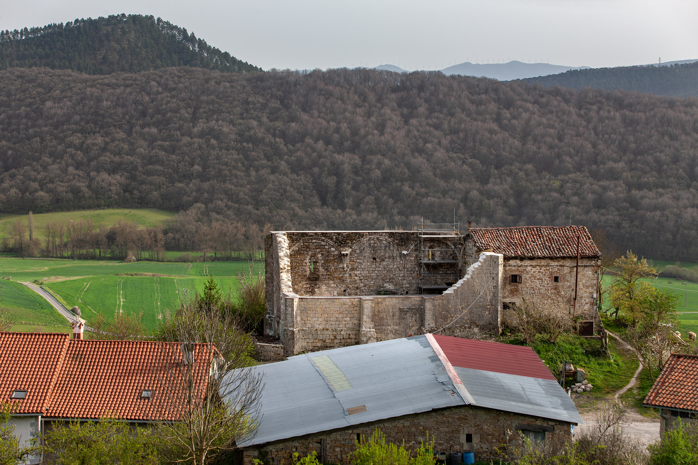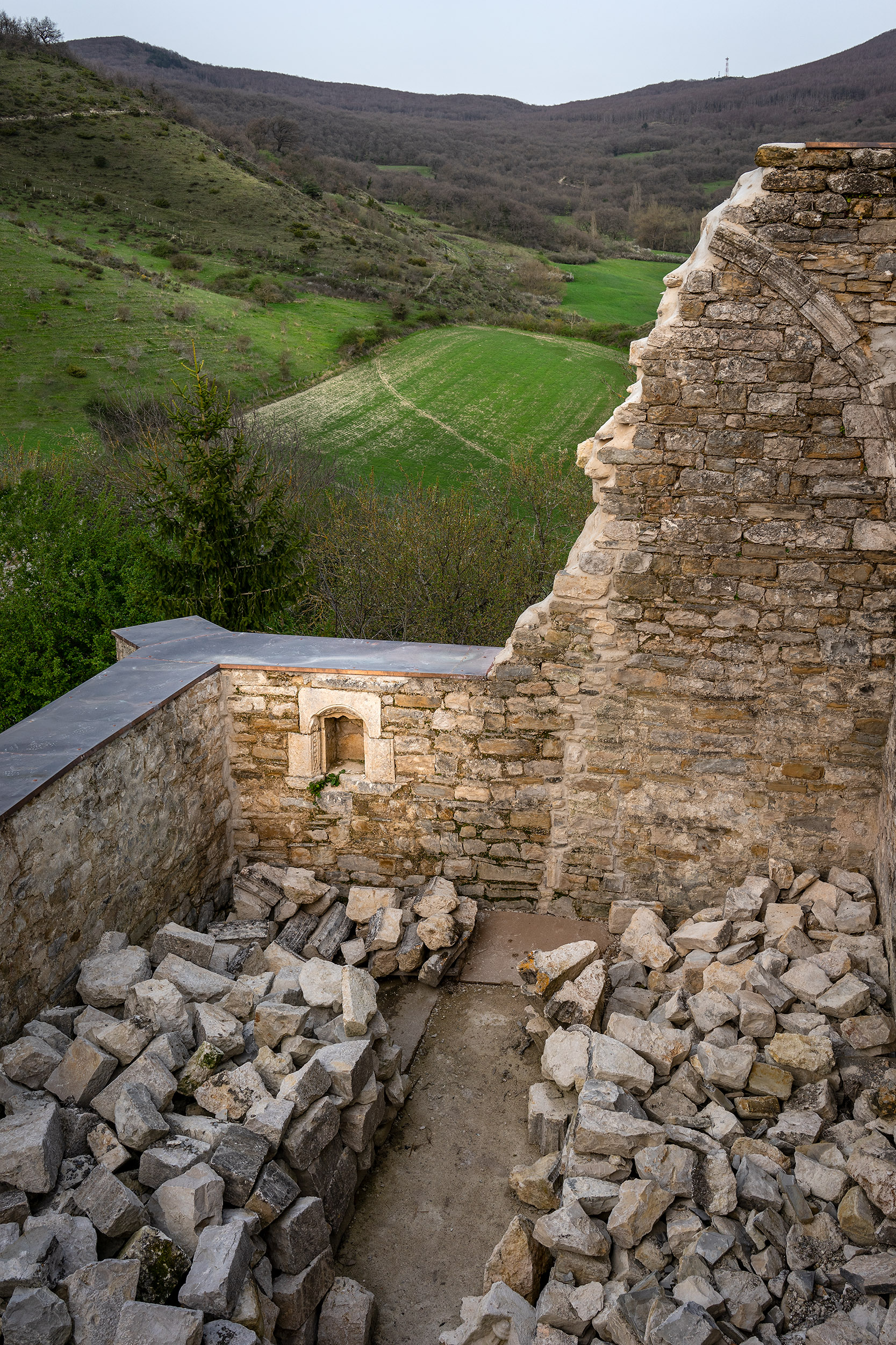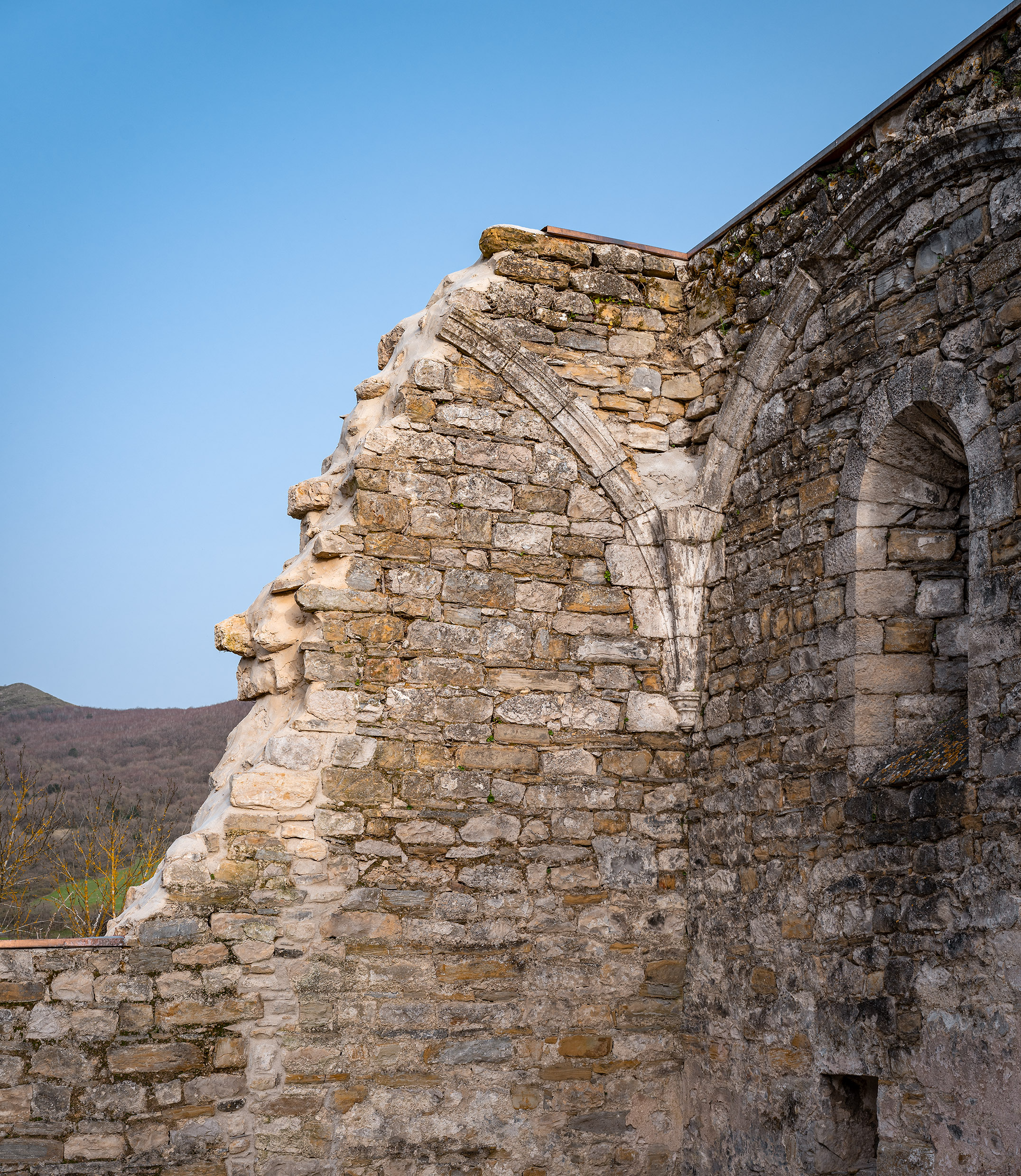 Proveniente de una antigua iglesia abandonada, su nivel de abandono forzó a realizar unos trabajos de consolidación de esta ruina. Obras forzadas por la seguridad de su entorno inmediato, la protección estatal de estas ruinas y las obligaciones de responsabilidad civil siguen manteniendo este tipo de marcas y trazos históricos que caracterizan vastas áreas rurales prácticamente deshabitadas.