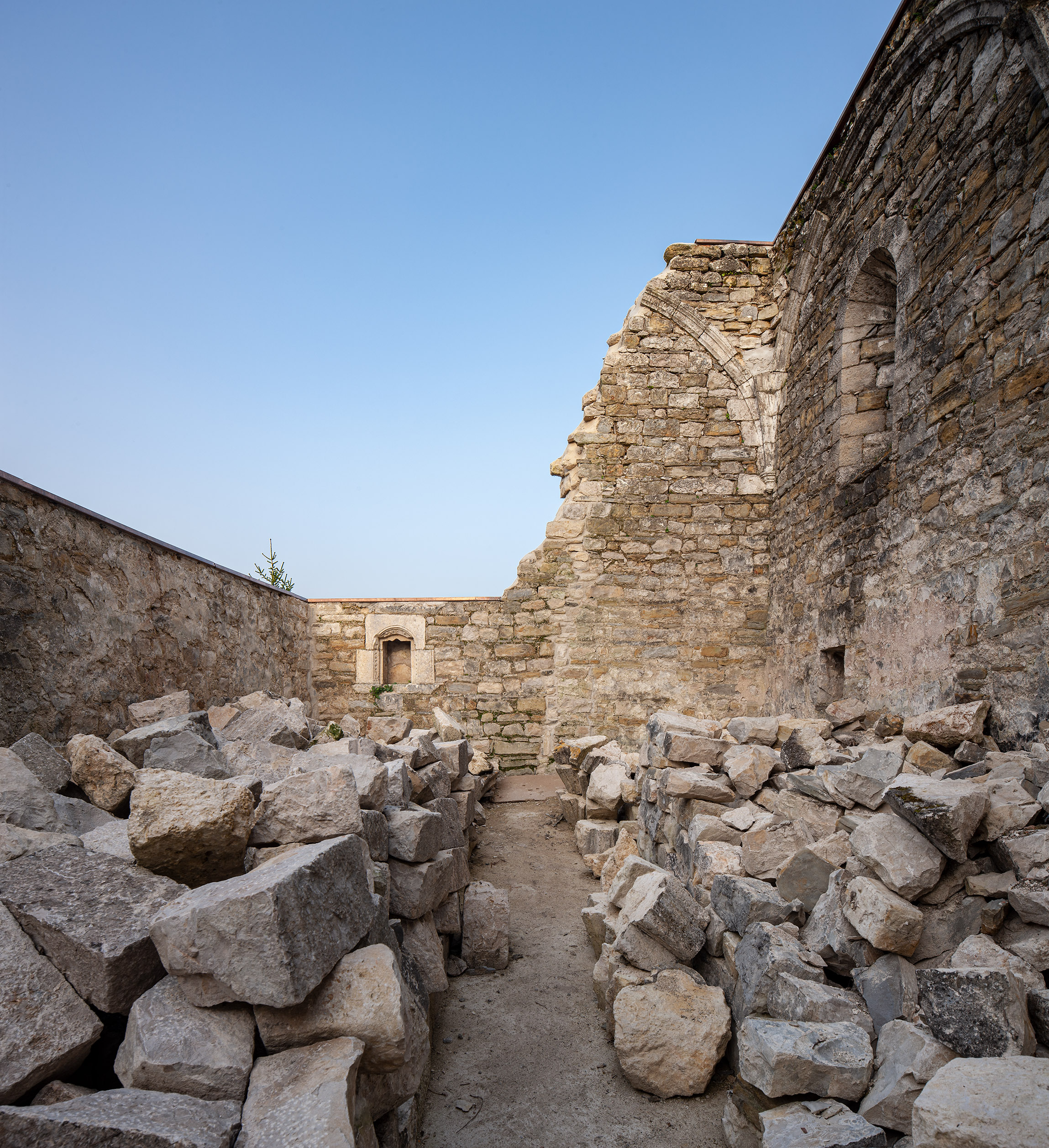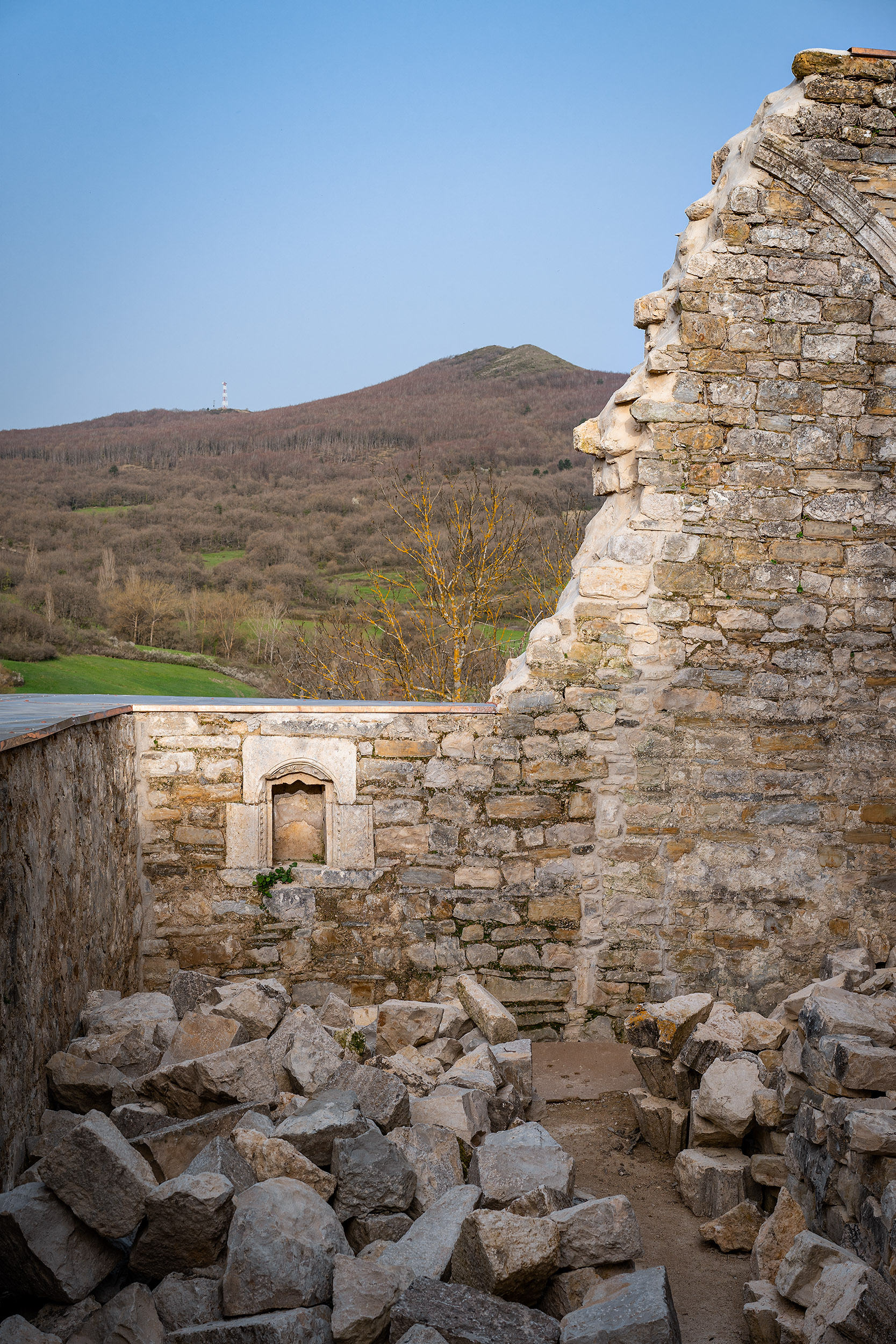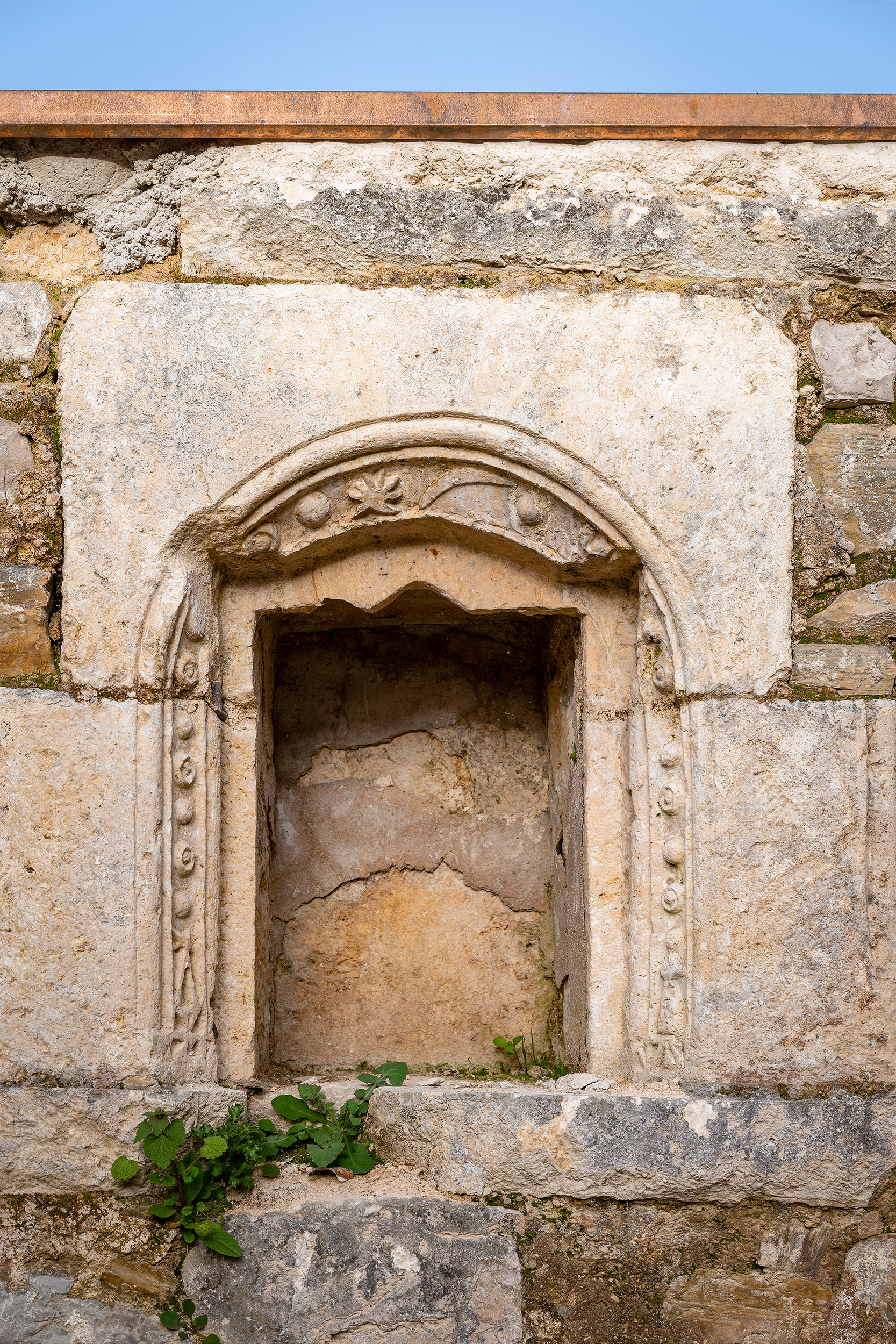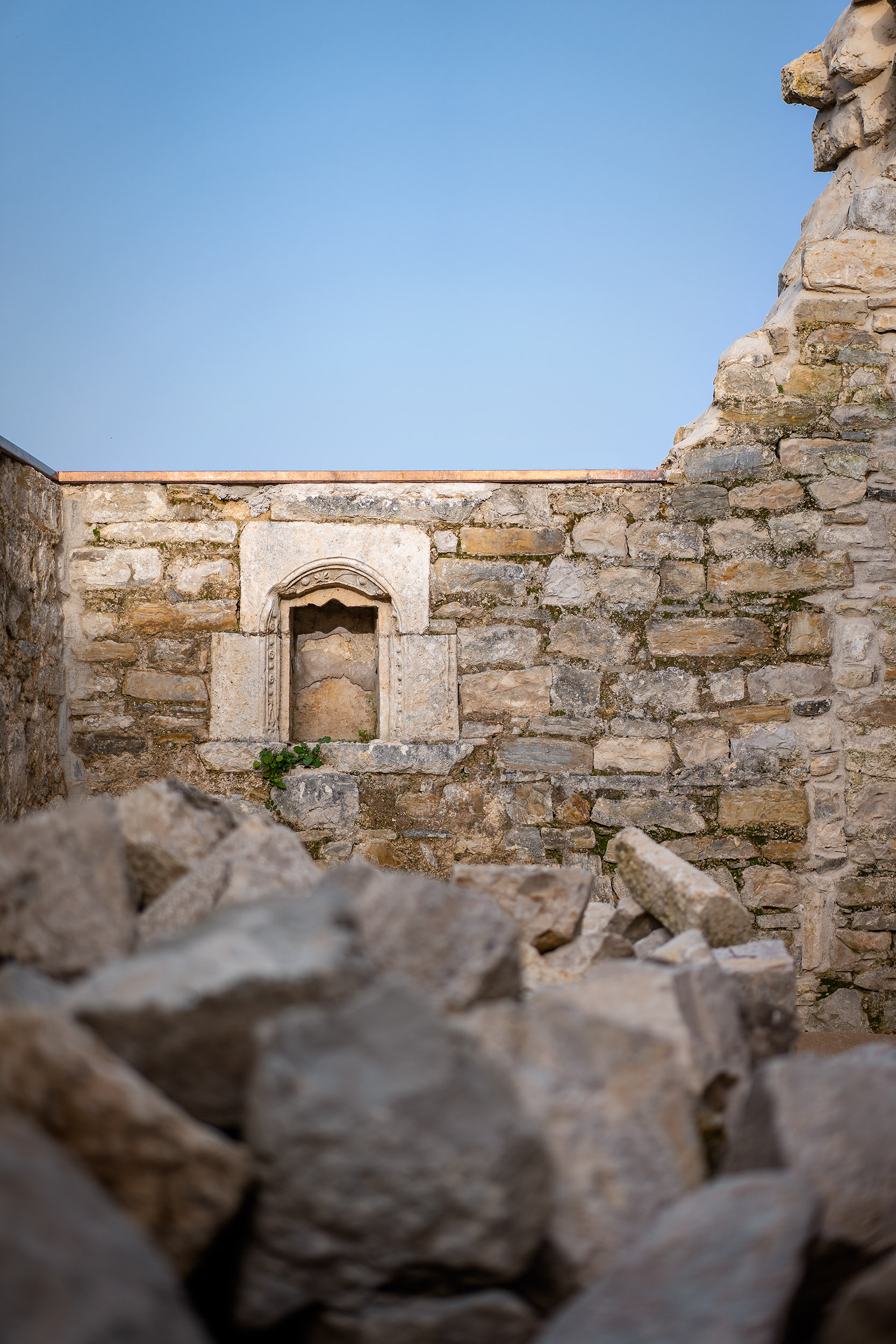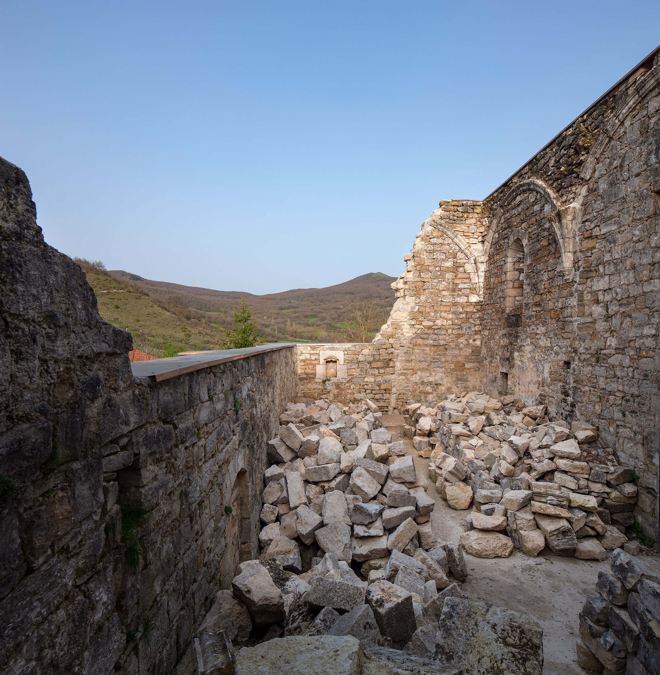 Se lograron salvar una hornacina de cantería que pudo alojar la reserva del sagrario y unos arranques de arcos preciosos que en su día sostuvieron una nave de bóvedas de arista.