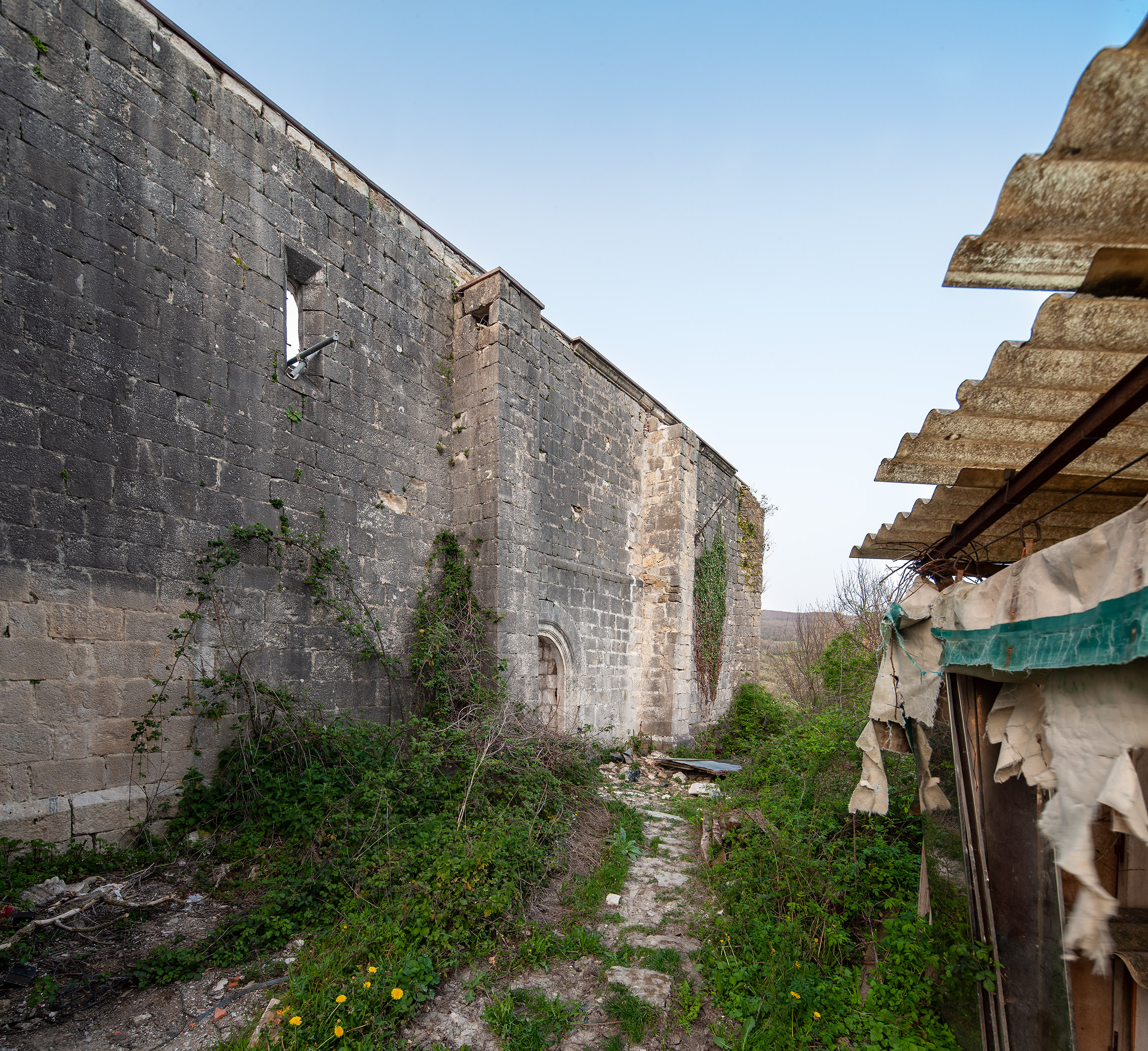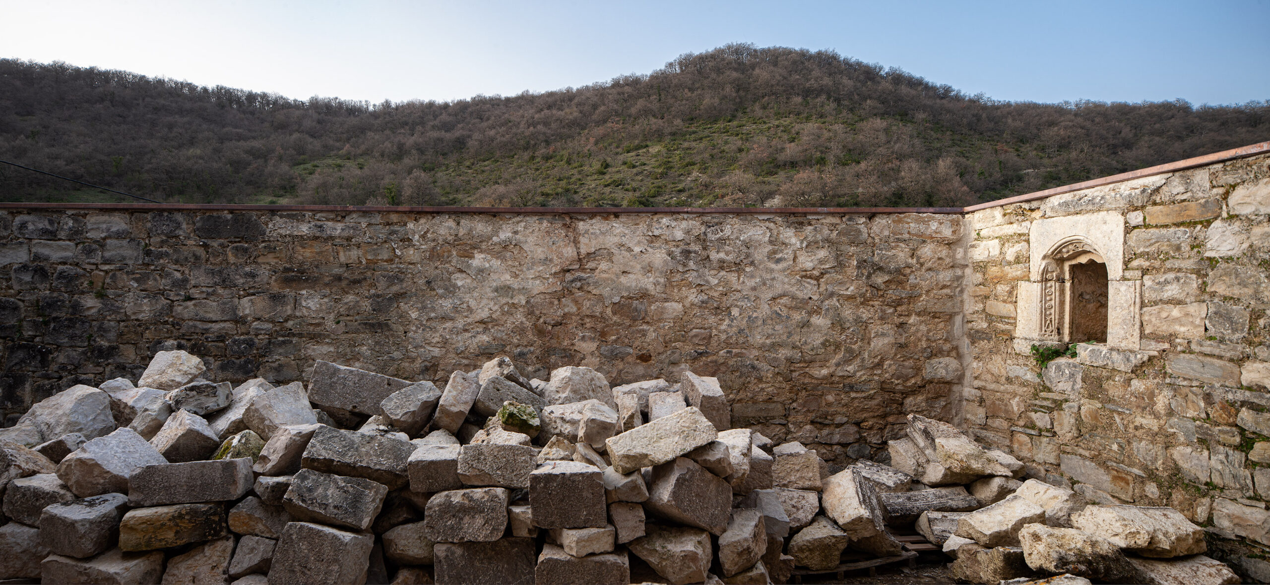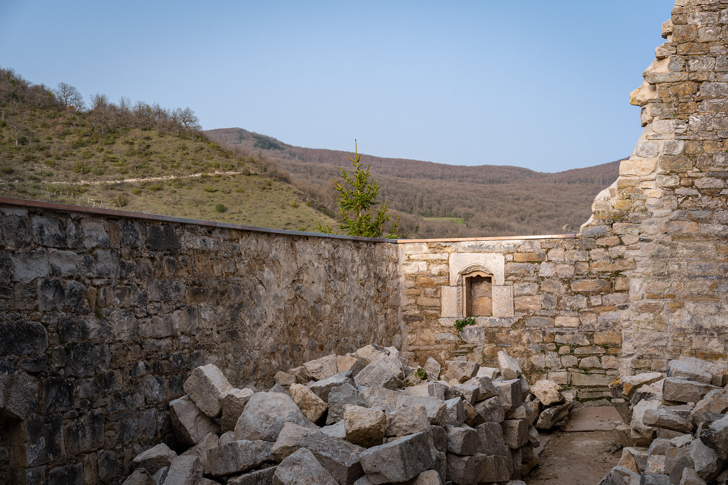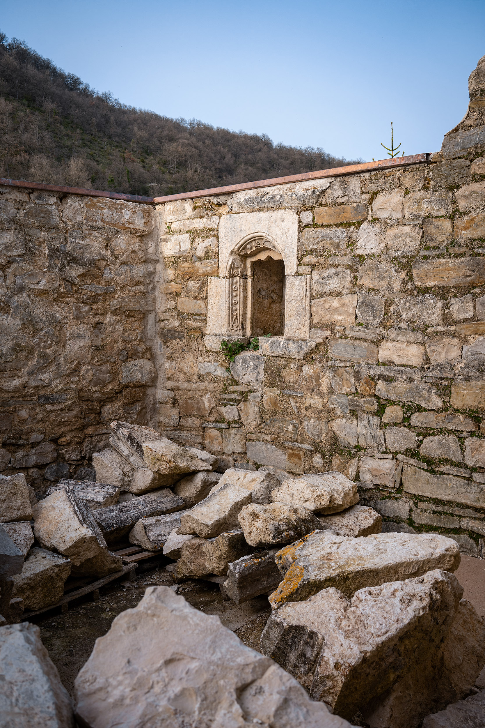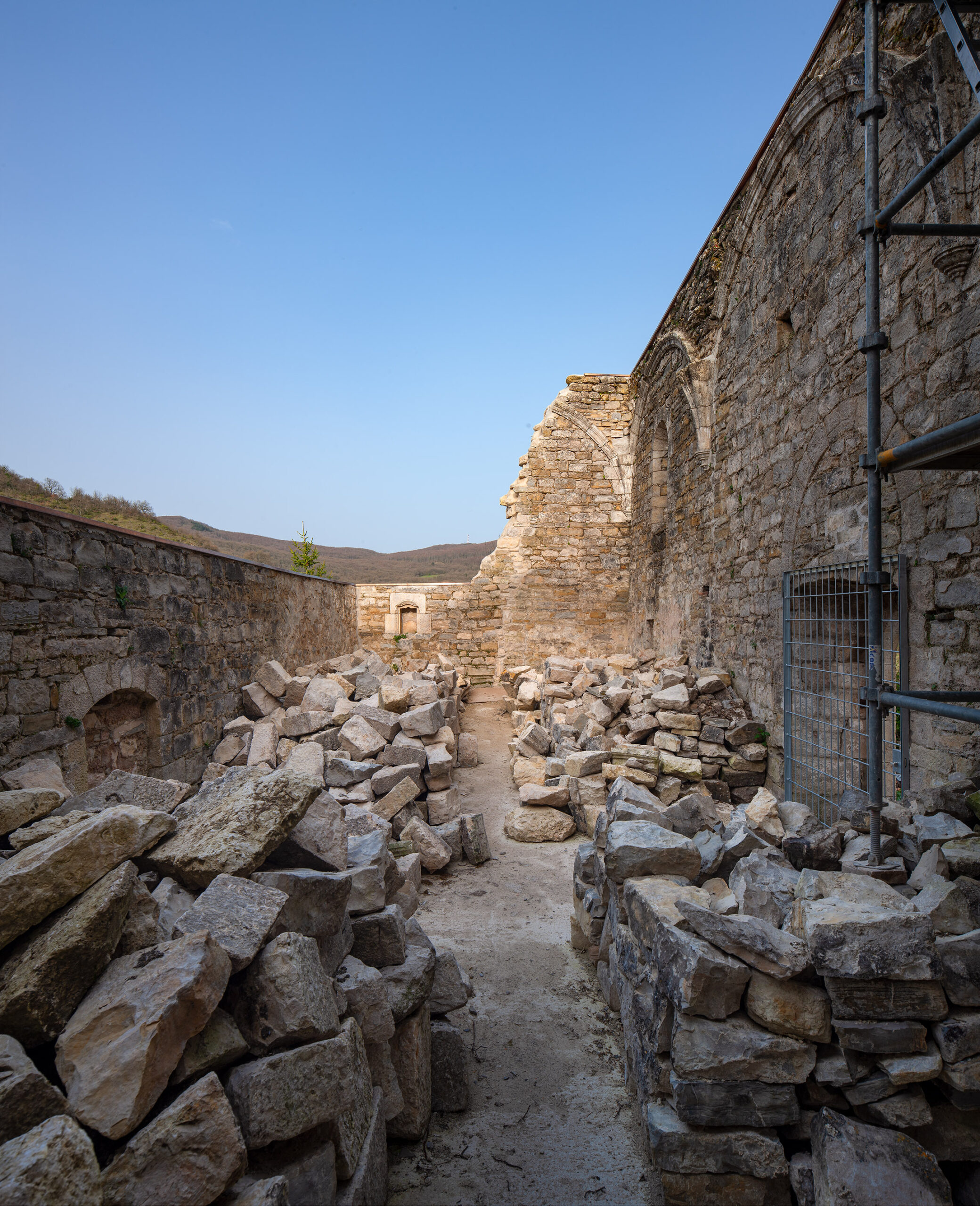 Se lograron salvar una hornacina de cantería que pudo alojar la reserva del sagrario y unos arranques de arcos preciosos que en su día sostuvieron una nave de bóvedas de arista.