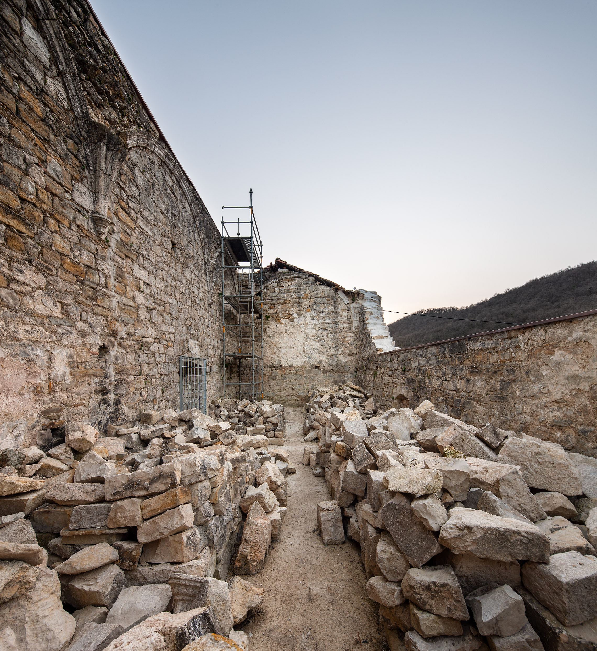 Utilizando cal, piedra, un alféizar de cobre, una grúa, una retroexcavadora y 6 cuerpos de andamios.