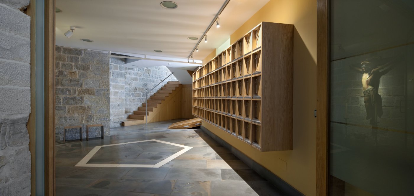 Las puertas de cierre de estas tumbas, columbarios, se diseñaron y montaron para quedar entreabiertas. Para transformar estas sencillas cajas de madera, cuya única función material es custodiar las cenizas de los cuerpos de los fallecidos, en una oportunidad para la expresión de la fe en la resurrección de los cuerpos. El diseño del cierre de seguridad pasa totalmente inadvertido integrándose en las sombras que generan la repetición de 100 planos inclinados; que a su vez caracterizan con su vibración como se presenta el frente del conjunto frente al extradós de los muros del ábside gótico.