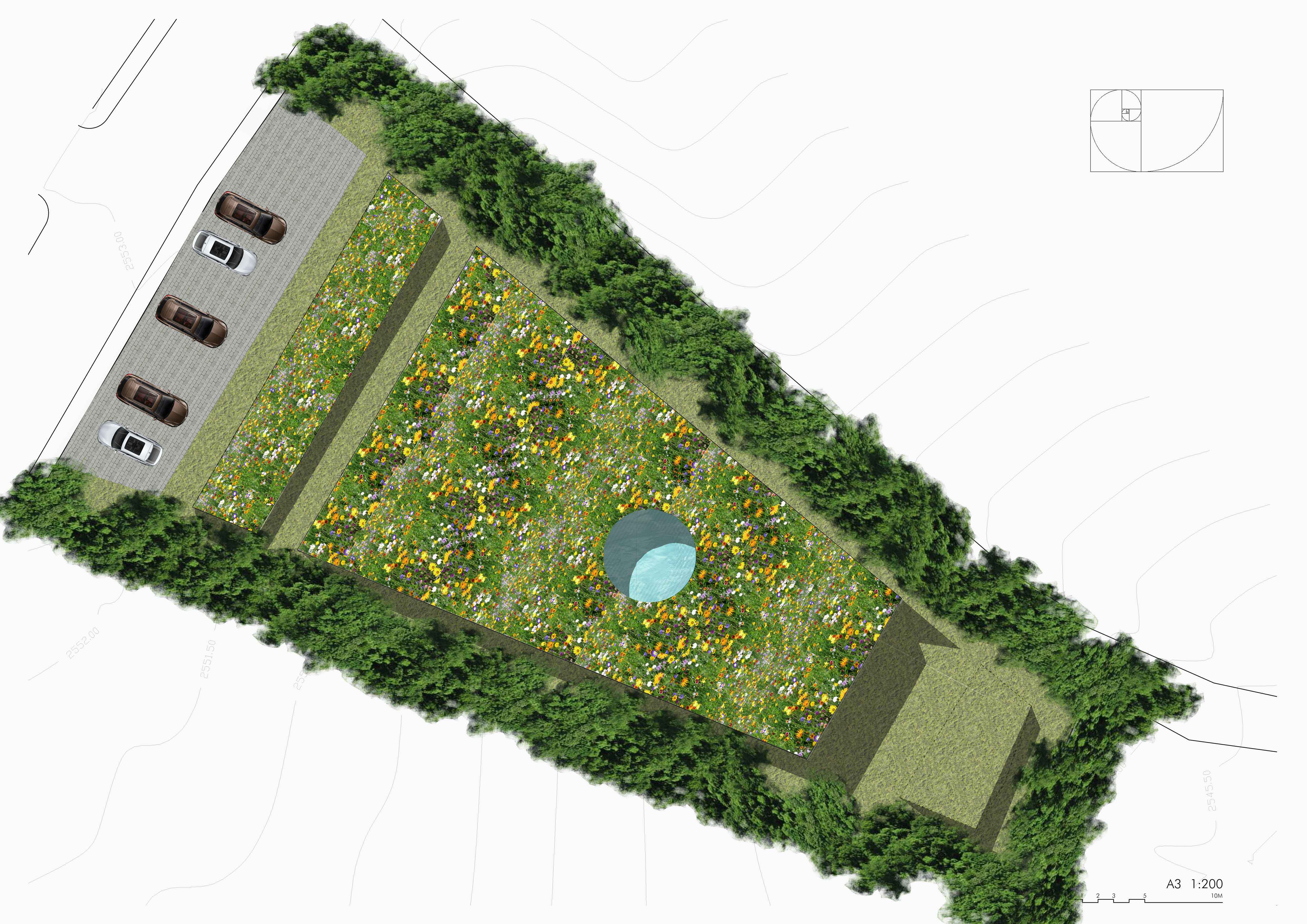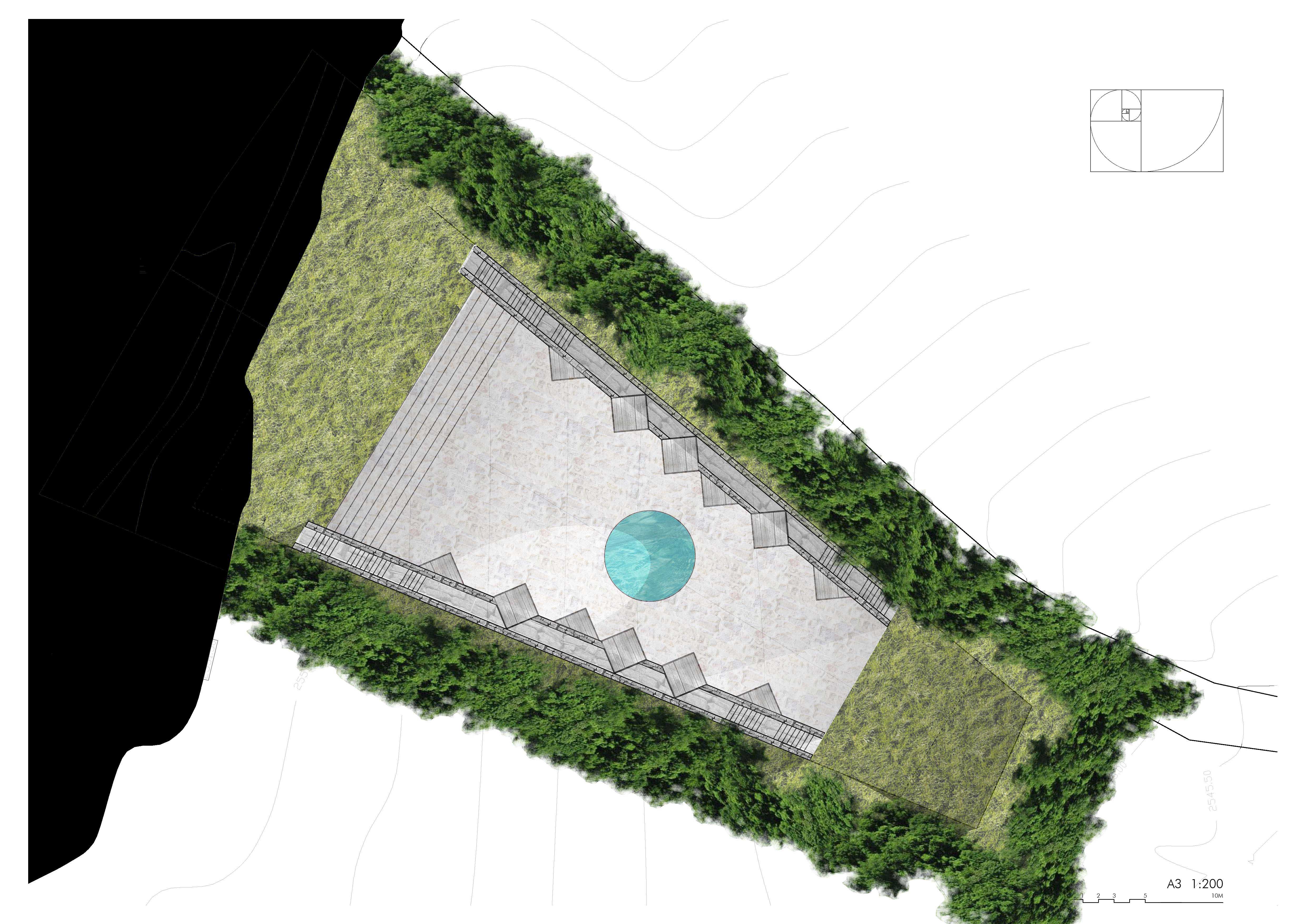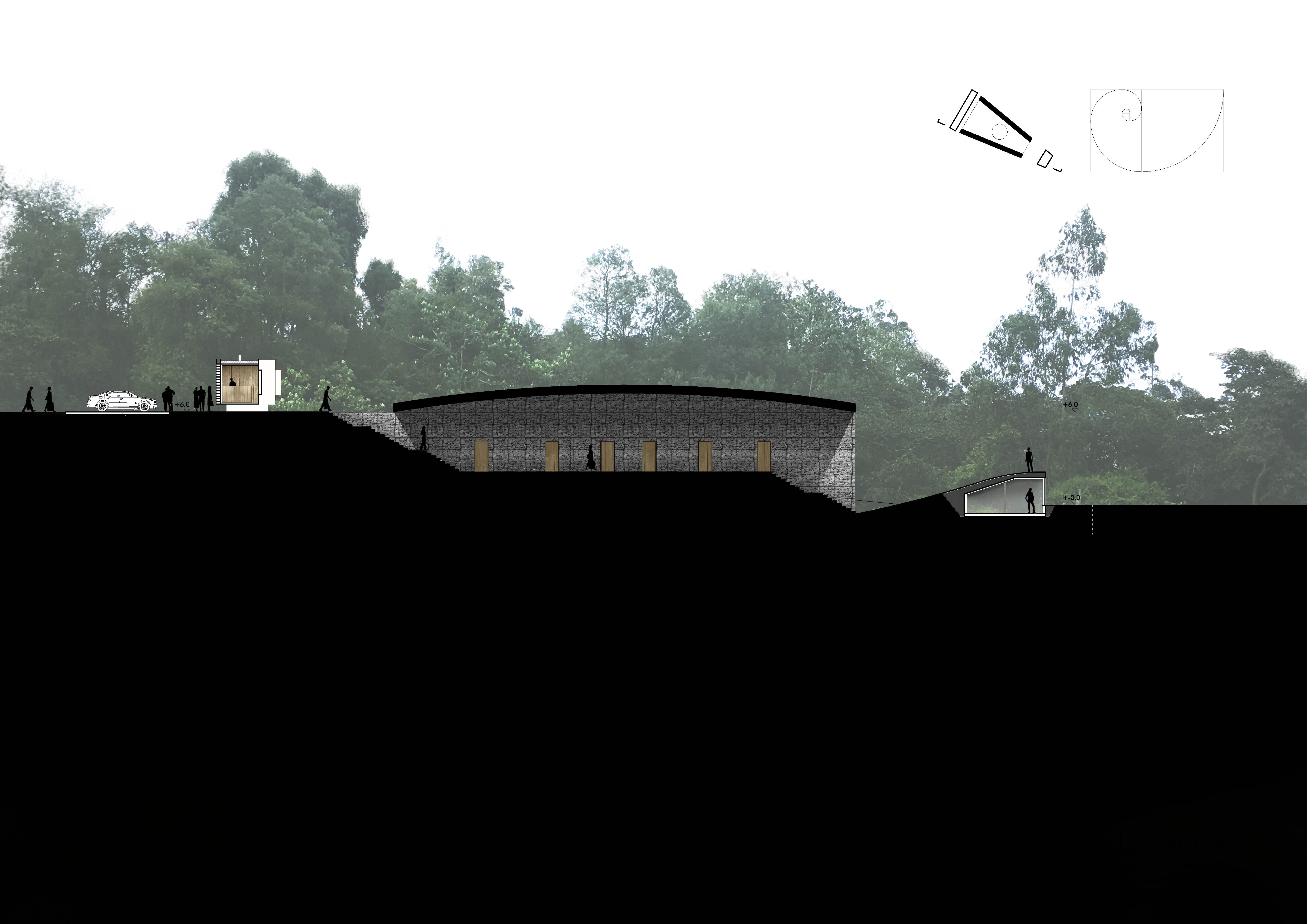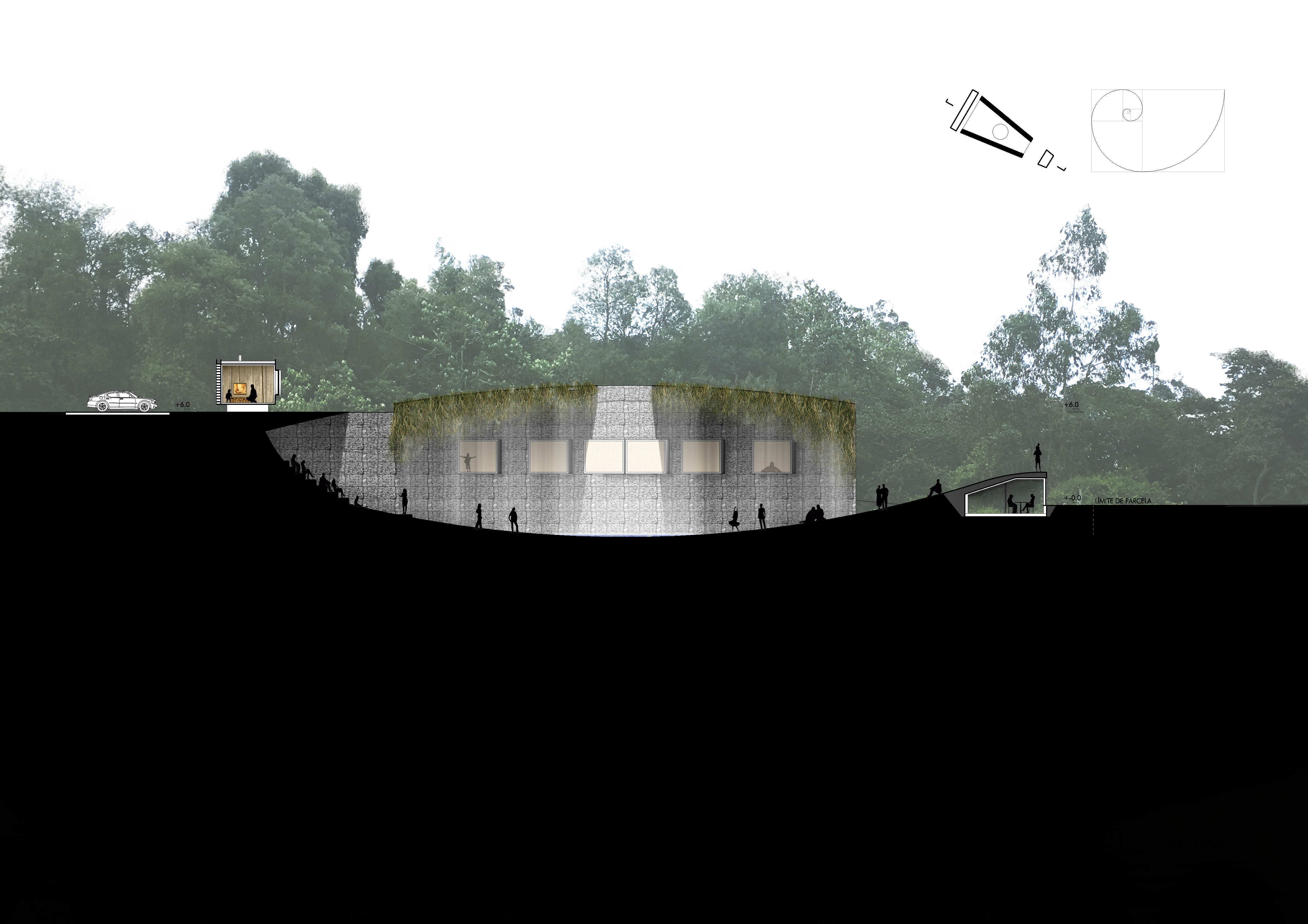 Inspirado en los cenotes de la Riviera Maya Mexicana se proyecta un recinto y un concepto de hotel básico en servicios pensado para el retiro de la vida urbana insertado en un extenso bosque aprovechando un desnivel del terreno para reducir el impacto de la construcción que se realiza priorizando el uso de materiales naturales, locales que se presentan directamente, crudos. Bajo un ligero tapiz vegetal se proyecta una estructura habitable, al modo de la cultura Maya, funcionando a compresión, cubierta por una red de cables en tensión que dibujan su catenaria.